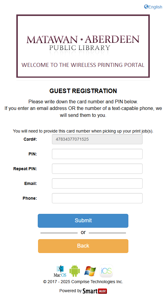 On the next screen, First Time Users will encounter several fields. The Card # field will have an automatically generated guest card number in it. The PIN field and the Repeat PIN field are required. Any numeric PIN can be used. The Email field OR the Phone field are also required for New/Guest users. If you use email, you will receive an email message and be able to login using your email address or the 14 digit account number and PIN. If you enter your phone you will receive a text message and be able to login using the 14 digit account number and PIN.